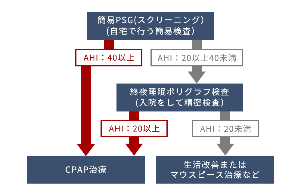 簡易PSGでのAHIの結果が40以上ですと、睡眠時無呼吸症候群と診断され、CPAPでの治療が決定します。20以上40未満であった方は、より精密な検査を行うため、終夜睡眠ポリグラフ検査が行われます。